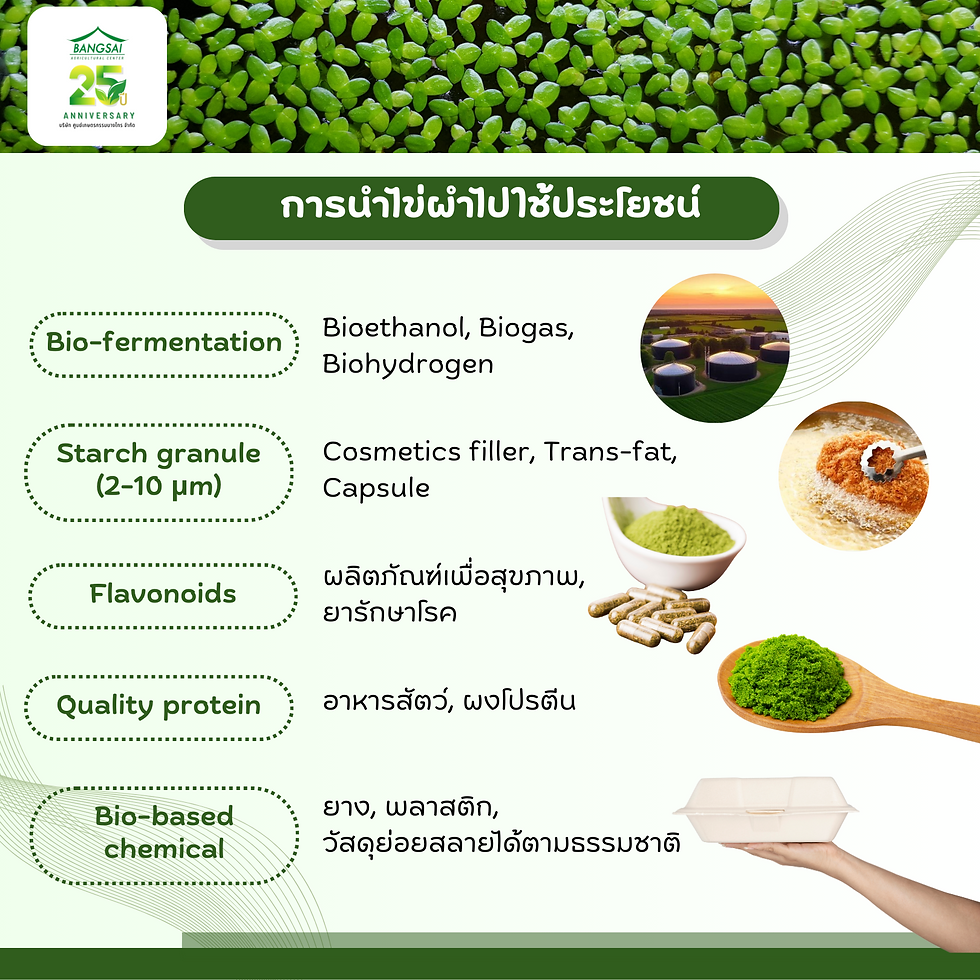 ในหลายประเทศ Wolffia และ Duckweed ถูกนำมาใช้เป็นอาหารสัตว์และอาหารมนุษย์ เนื่องจากมีโปรตีนสูงและย่อยง่าย Plant Factory ช่วยให้การผลิตมีความต่อเนื่องและควบคุมคุณภาพได้ดี เช่น การผลิต Wolffia สำหรับอาหารเสริมโปรตีนในรูปแบบผงหรือแคปซูล รวมถึงการใช้ Duckweed เป็นอาหารสัตว์น้ำที่มีคุณภาพสูง